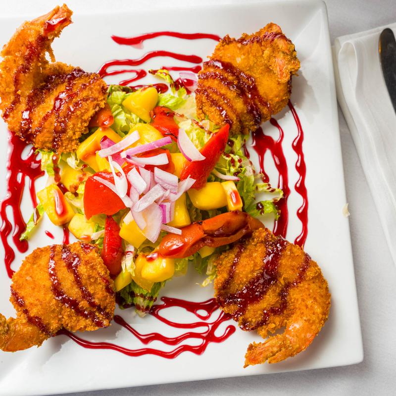 Coconut-crusted shrimp served over mango salad and drizzled with raspberry sauce