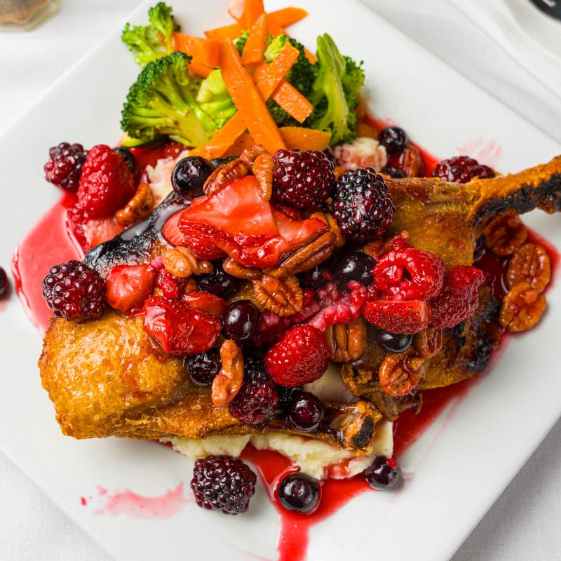 Served over greens with raspberry balsamic reduction