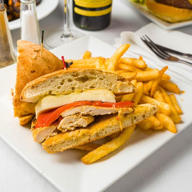 Grilled chicken, fresh mozzarella, basil, roasted red peppers, and drizzled with olive oil